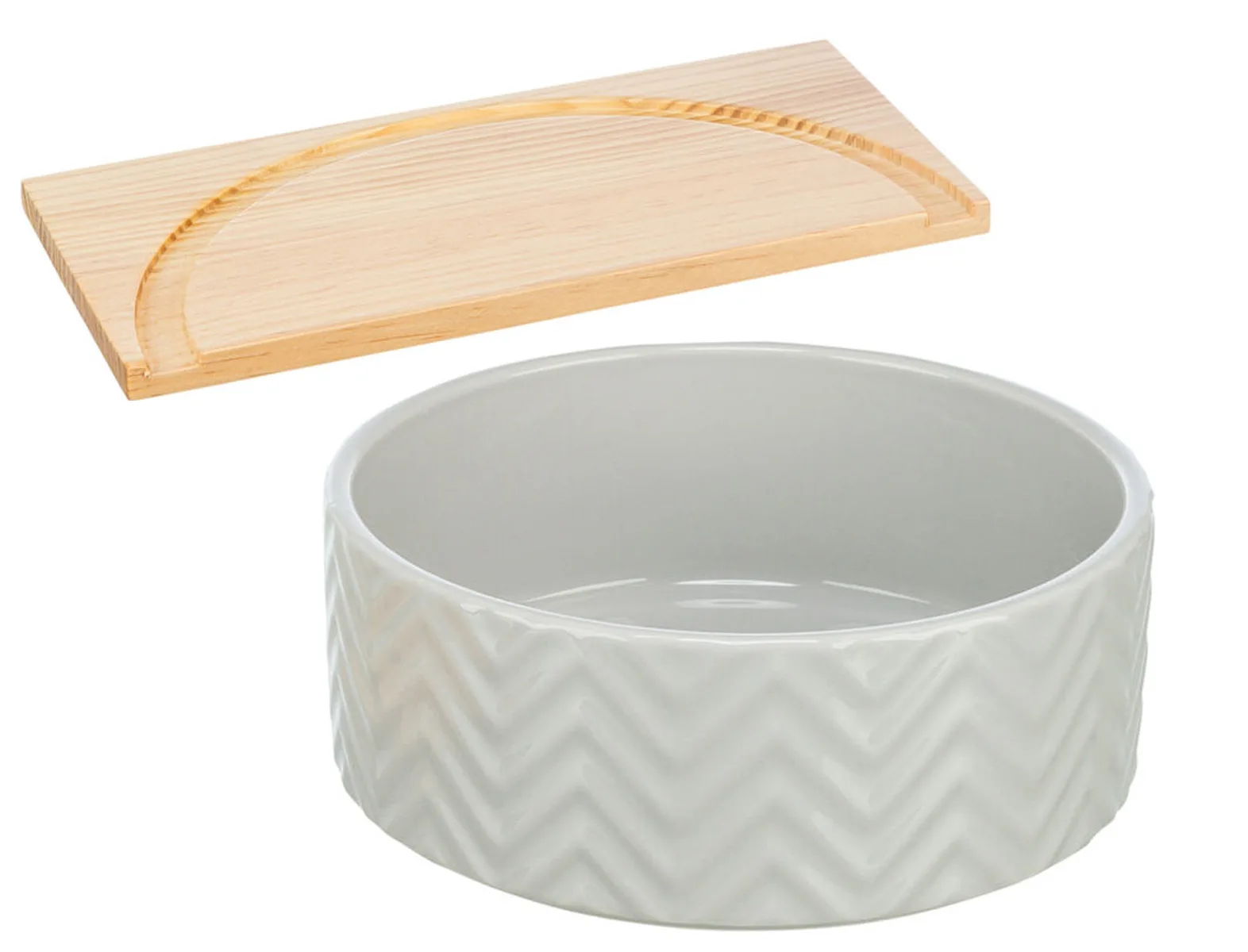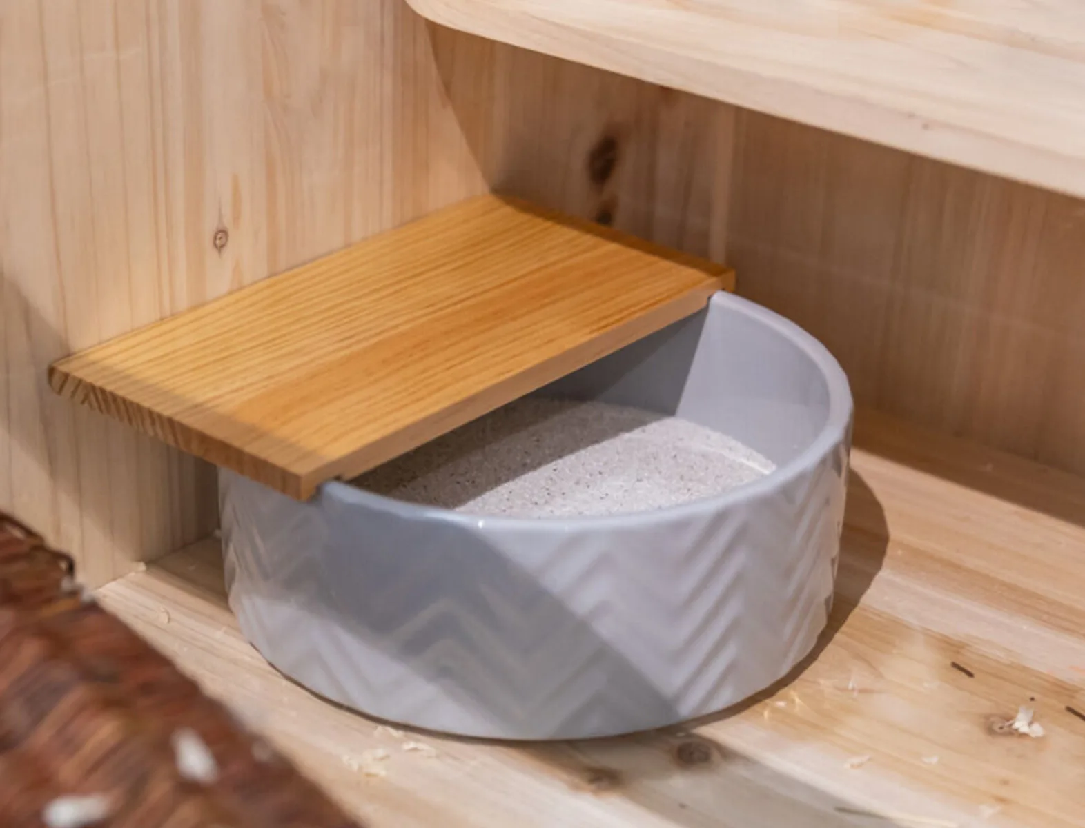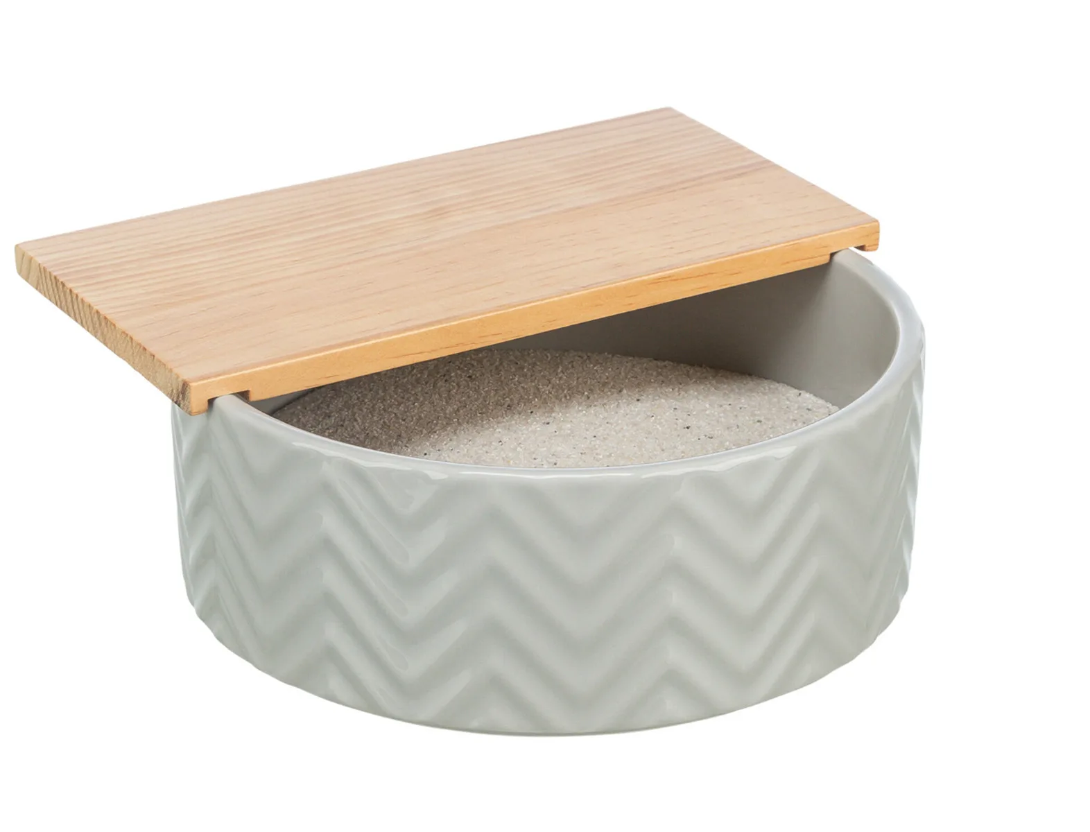 Ein stabiles Sandbad aus einer Keramikschale und einem abnehmbaren Plateau aus Holz.