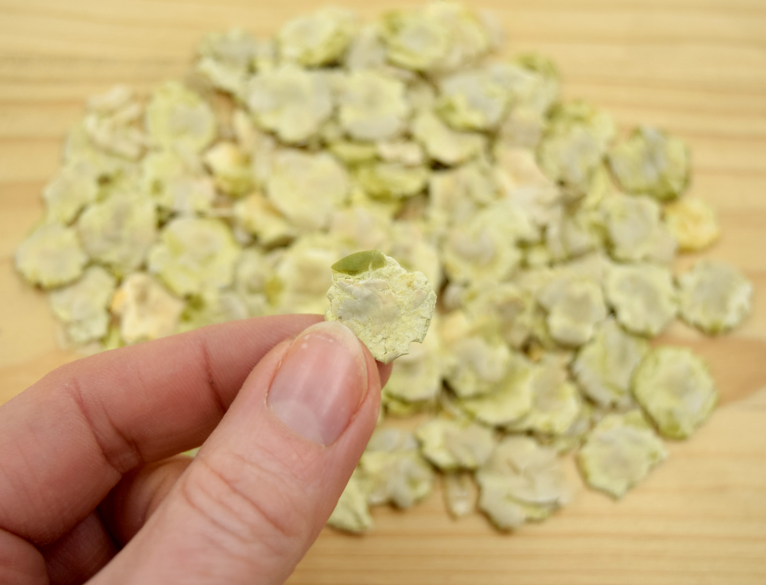 Erbsenflocken sind zu 100% gewalzte und getrocknete Erbsen. Sie enthalten keine weiteren Zusätze.