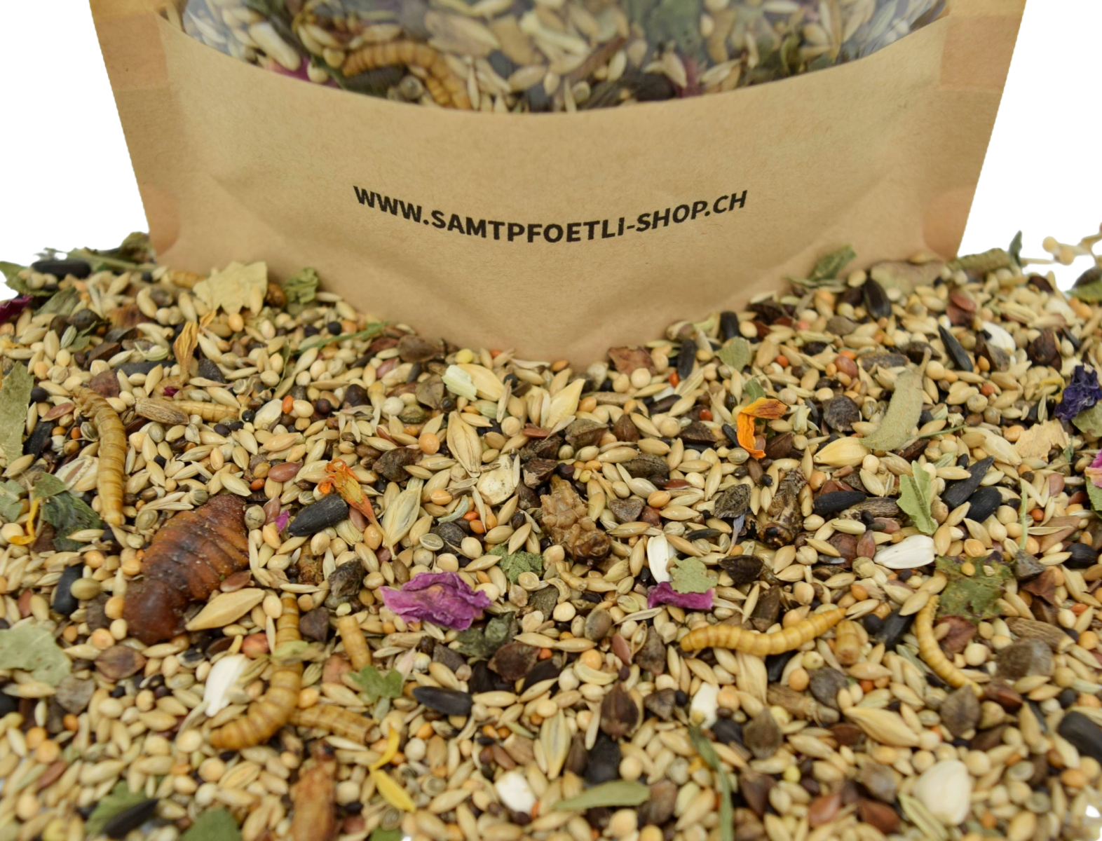 Spitzsaat, Buchweizen, Gerste, Hanfsamen, Kardisamen, Knaulgrassamen, Mariendistelsamen, Rotschwingelgrassamen, Bio CH-Mehlwürmer, Bio EU-Grillen, Bio CH- Seidenraupenpuppen, Japanhirse, Grüne Hirse, Gelbe Hirse, Marokkohirse, Platahirse, Rote Hirse, Senegalhirse, Silberhirse, Basilikumsamen, Fenchelsamen, Hagebuttensamen, Zichoriensamen, Nigersamen,Kümmelsamen, Leinsamen, Spinatsamen, Obstblätter, Kornblumenblüten, Spinatstiele, Ringelblumenblüten und Spitzwegerich.